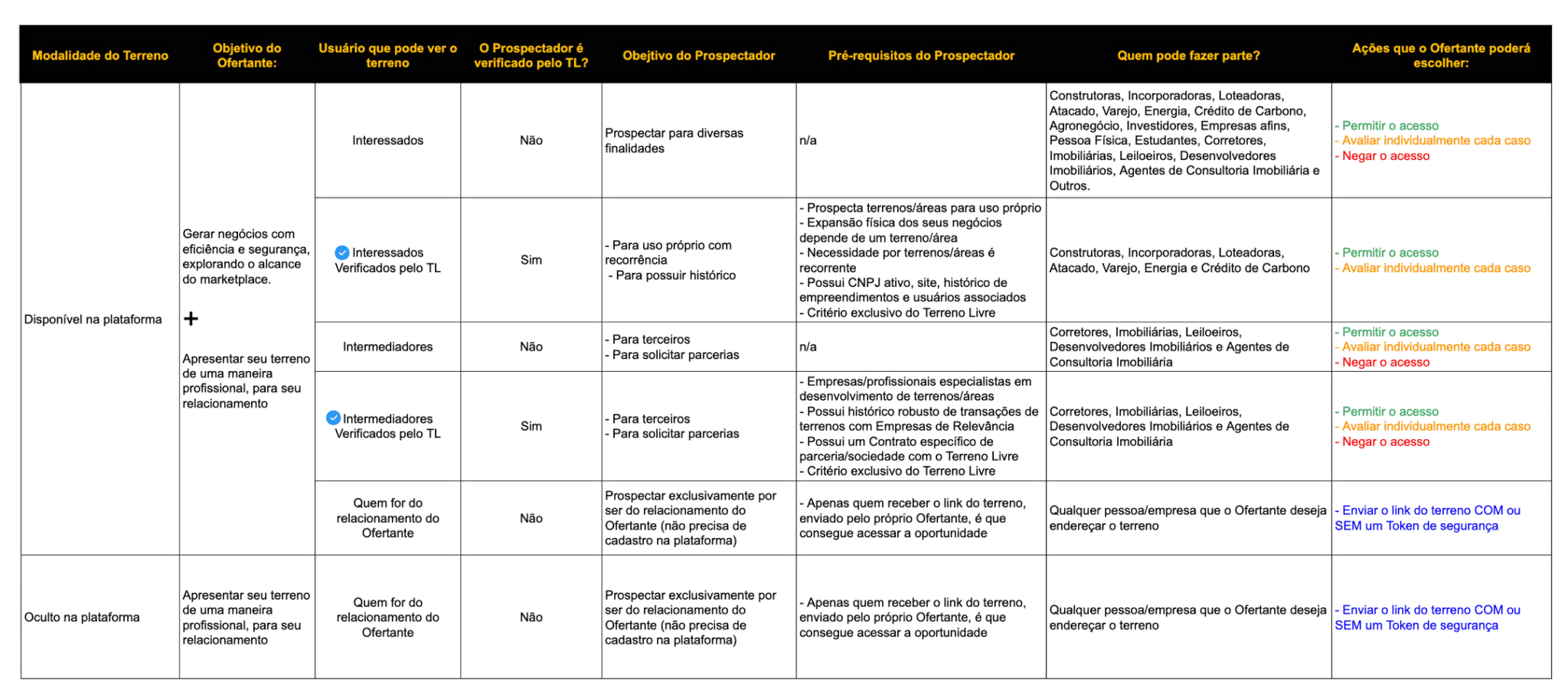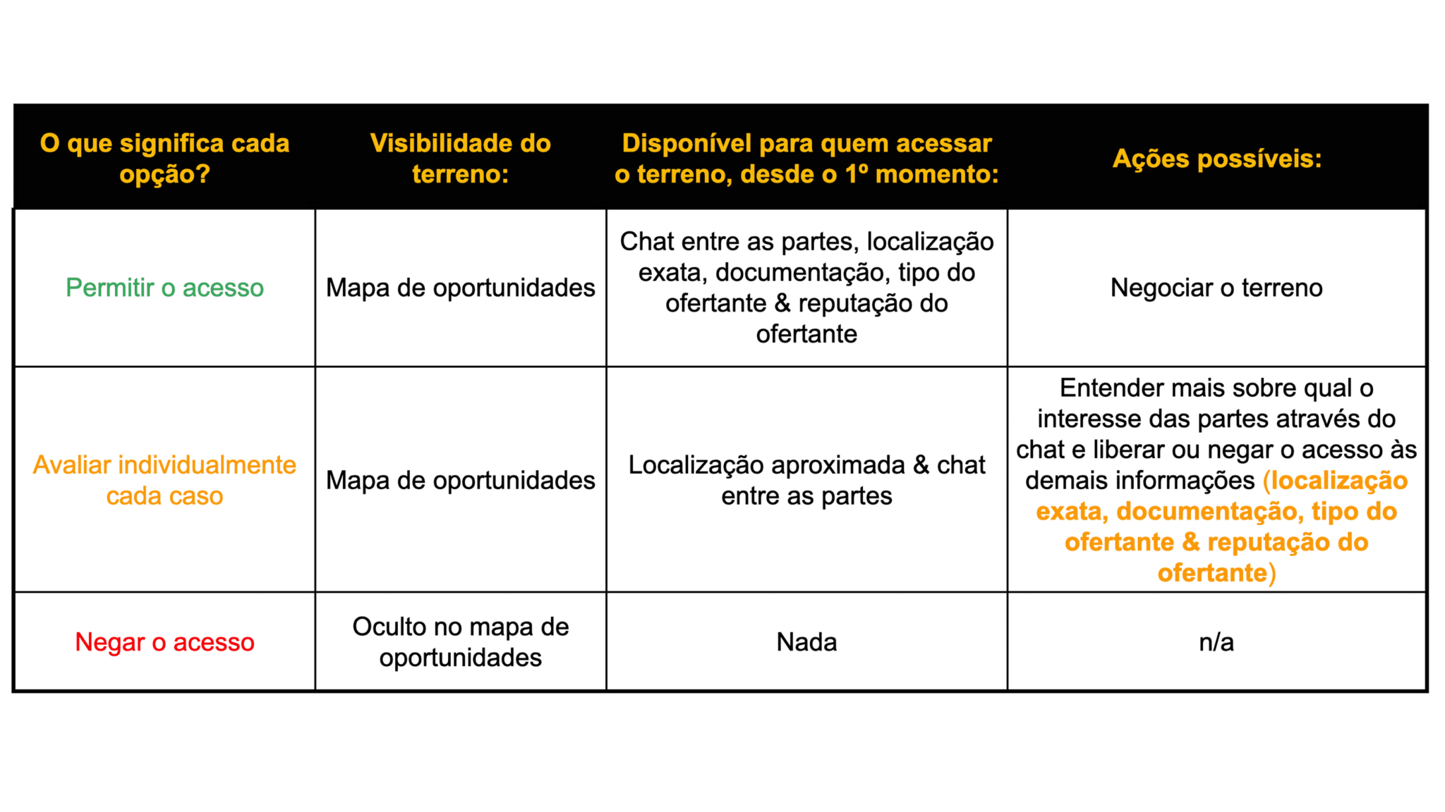 Sendo assim, a visualização dos terrenos na plataforma foi dividida em 4 grupos, conforme o quadro abaixo: